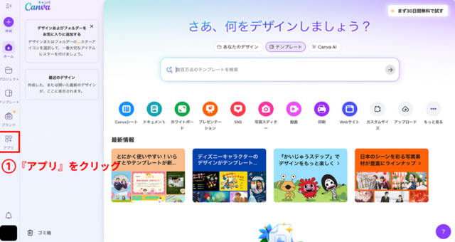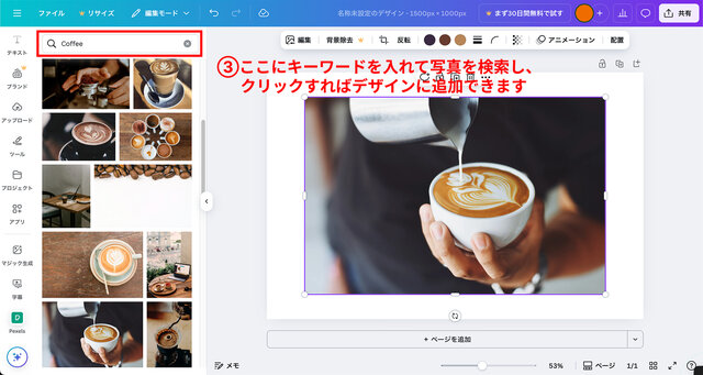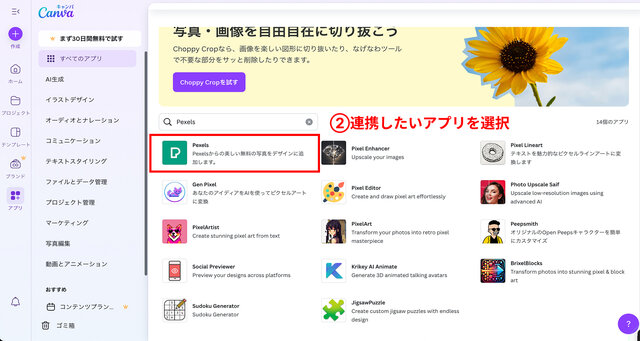 - 左メニューの「アプリ」からPexelsまたはPixabayを選択し、1章で決めたアカウントのテーマ(例:美容なら「スキンケア」、就活なら「ビジネス」)に合う写真を検索して背景に配置します。