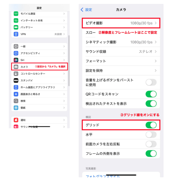 まずは、撮影前にスマートフォンのカメラ設定を確認しましょう。