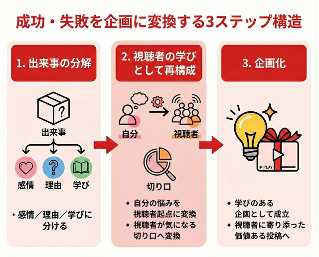 特に失敗体験は、そのまま愚痴として伝えるのではなく、そこから得た「気づき」「対策」「学び」として伝えることで、視聴者に寄り添う企画にすることができます!