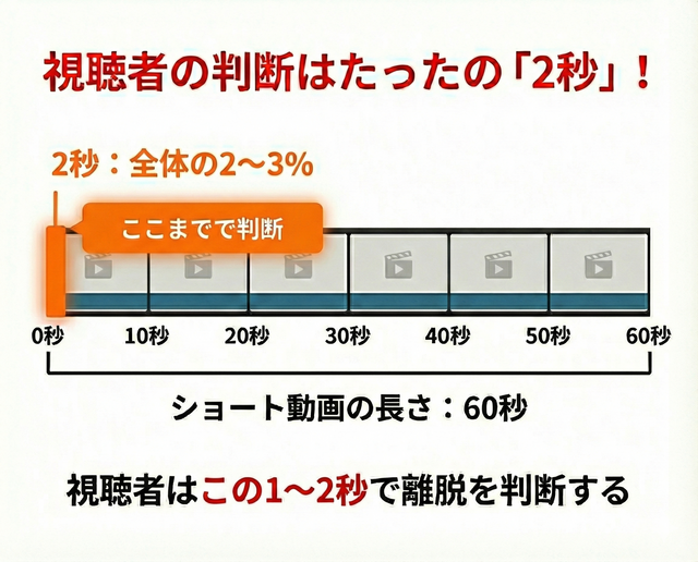 視聴者が離脱を決める平均時間は 1〜2秒以内 と非常に短く、ほとんどが冒頭の印象だけで「続きは見ない」と判断されてしまいます。
