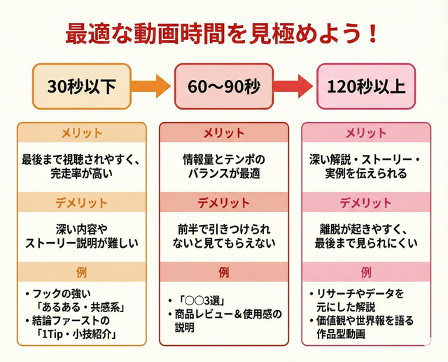 最適な動画の長さは、コンテンツの内容やアカウントの特性によって柔軟に変化させることが大切です。