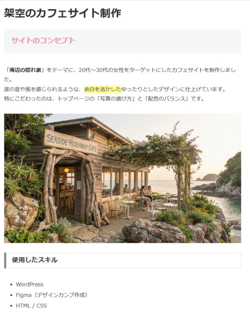 タイトル:架空のカフェサイト制作 サイトのコンセプト 「海辺の隠れ家」をテーマに、20代〜30代の女性をターゲットにしたカフェサイトを制作しました。 波の音や風を感じられるような、余白を活かしたゆったりとしたデザインに仕上げています。 特にこだわったのは、トップページの「写真の選び方」と「配色のバランス」です。 使用したスキル WordPress Figma(デザインカンプ作成) HTML / CSS