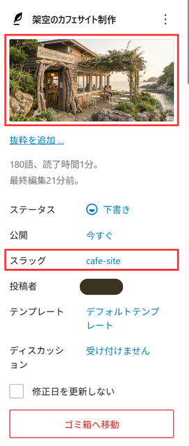 - 場所: サイドバーの上の方(ステータスの下あたり)にある「スラッグ」という項目。