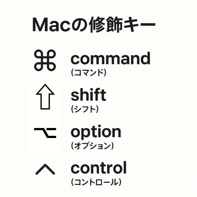 またMacのショートカットキーは、メニューバーなどでは特殊な記号で表記されることがあります。以下の図で代表的なキーの記号を確認しておきましょう。