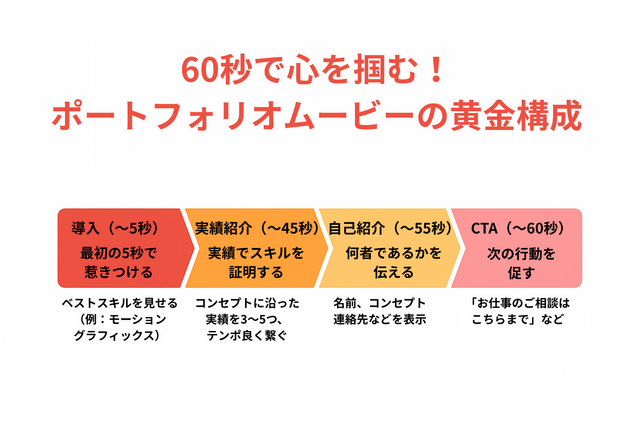 ポートフォリオムービーには、以下の「黄金構成」があります。