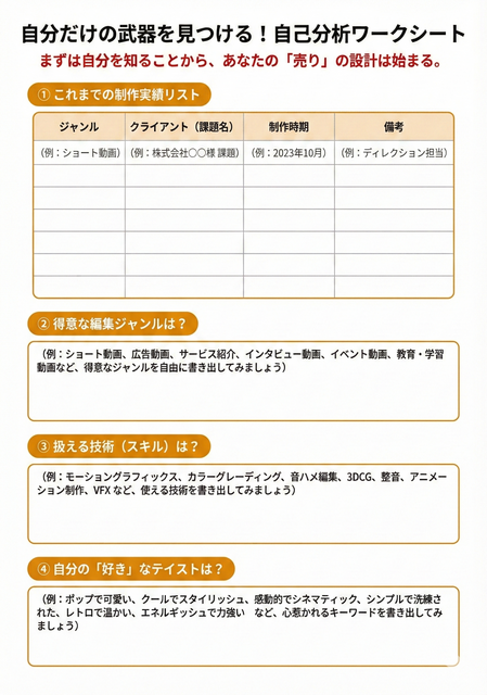 - コンセプト案2(スキル特化型):「リアルな共感を呼ぶ "UGC風" 編集のスペシャリスト」
