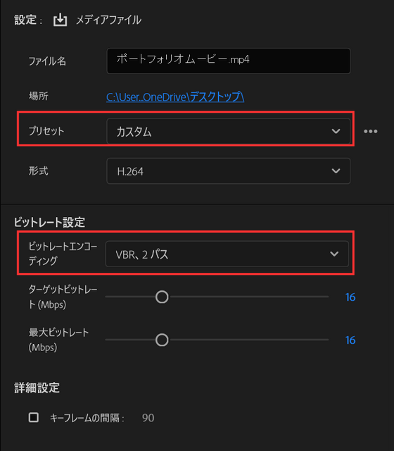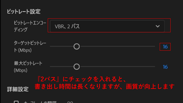 「VBR, 2パス」を選択し、ターゲットビットレートを16Mbps程度に設定すると、高画質でありながらファイルサイズも抑えることができます。