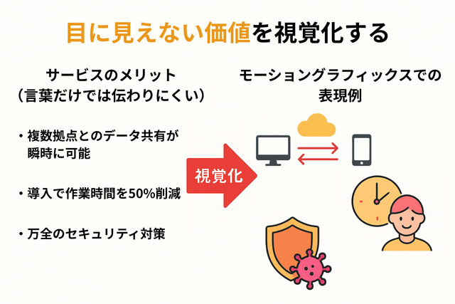 そのため、その価値や利便性を伝えるためには、目に見えない概念を、視聴者が直感的に理解できる形に「視覚化」する工夫が不可欠です。