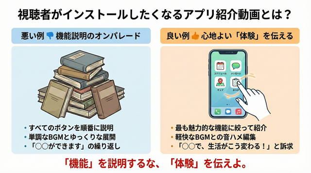 優れたアプリ紹介動画は、単なる機能説明に終始しません。