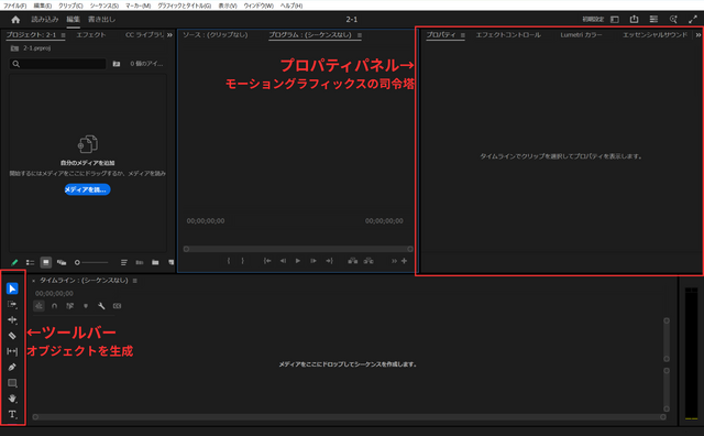 Premiere Proでモーショングラフィックスを作成する際の中心的な作業場所が、「プロパティパネル」と「ツールバー」です。
