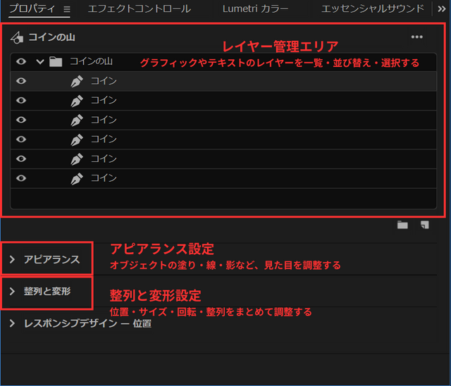 このパネルを使えば、After Effectsのような専門ソフトを使わなくても、Premiere Pro内で直接テキストや図形を作成し、アニメーションの基礎を設定することができます。