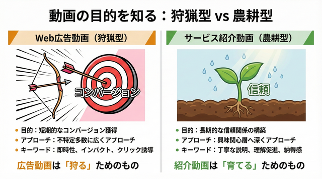 Web広告動画が、不特定多数の潜在顧客に対して瞬間的にアプローチし、クリックや購入といった短期的な行動を促す「狩猟型」のコミュニケーションだとすれば、サービス紹介動画は、すでに製品やサービスにある程度興味を持っている見込み顧客に対して、じっくりと価値を伝え、深い理解と信頼を育む「農耕型」のコミュニケーションと言えます。