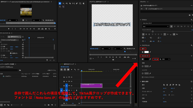 Premiere Proの「エッセンシャルグラフィックス」で、TikTok風のテロップを作成しましょう。