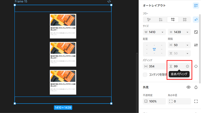 幅を「固定(1080px)」、高さを 「コンテンツを内包」 に設定します。これでカードが縦に自動伸縮します。