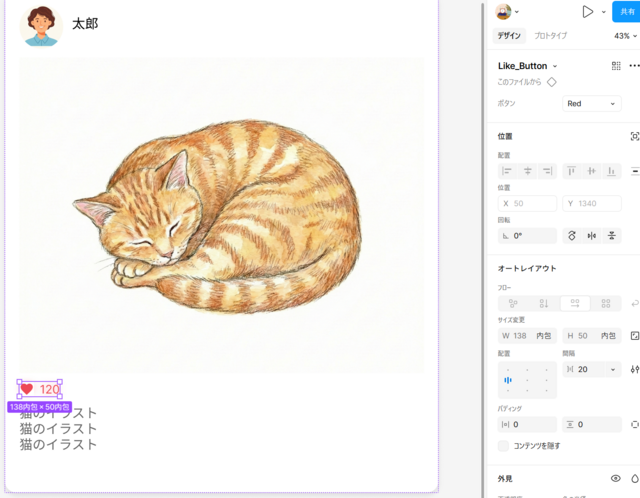 「ヘッダー」「メイン画像(今は図形)」「いいねボタン」「本文」を順番に選択し、オートレイアウト化(縦)する(完成イメージはオブジェクト間隔は30)