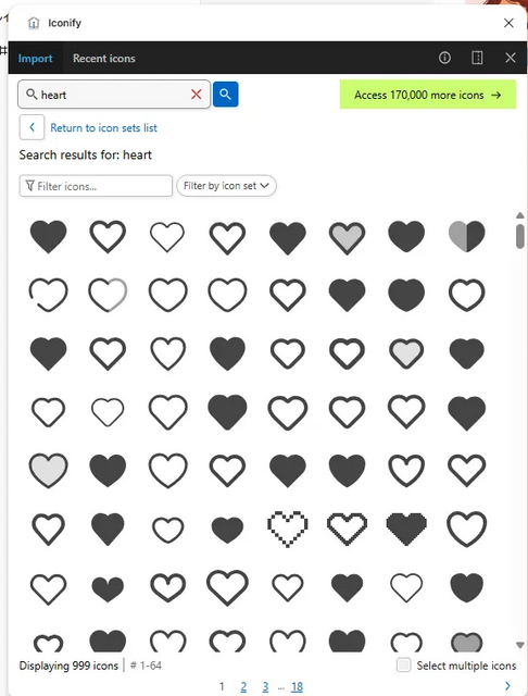 プラグイン「Iconify」を起動し、「heart」と検索してハートのアイコンを配置します