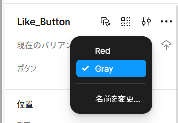 ・「通常時(グレー #666666)」と「いいね後(赤色 #FF0000+ドロップシャドウ)」を、右パネルのプロパティから一瞬で切り替えられる。